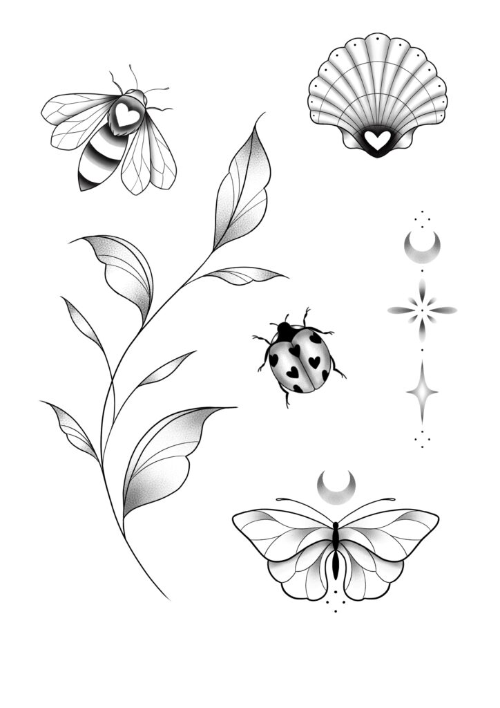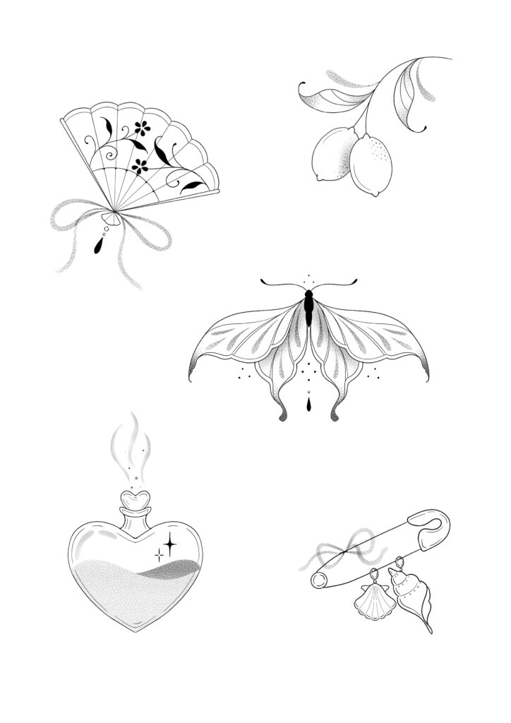 Située à Lille chez Atelier Amore, je développe un univers autour du fine line illustratif, mêlant précision du trait et travail du dotwork.